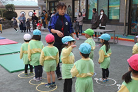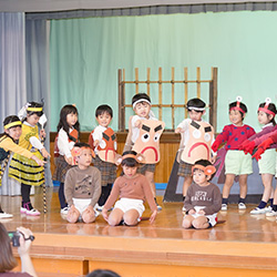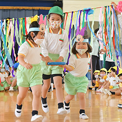 また、日頃から「なわとびやさかあがり」に代表される体育遊びにも力を入れています。他にもとびばこやマット運動など、様々な体育遊びや活動を通して、基礎体力を養い、基本的な運動能力を身につけ、健康な心身の育成を目指しています。