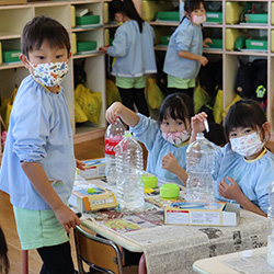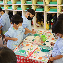 様々な教材や用具を使った造形遊びからイメージの面白さ、表現の楽しさを味わい、創造力を育みます。