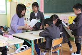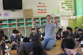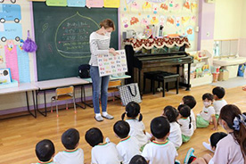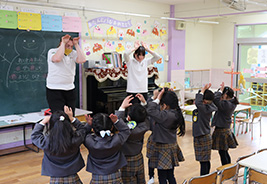 「英語で遊び英語で学ぶ」をモットーに、日本人と外国人講師がペアで歌や絵本等を用いて楽しく指導します。