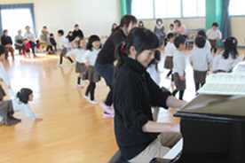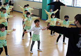 全身を使い、リズム取りやステップの練習をします。音楽に合わせて楽しく踊ることで、表現力、積極性、協調性を養います。